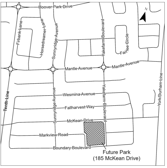 A new park is set to enhance the community experience at 185 McKean Drive in Stouffville, forming an integral part of a subdivision development. Spanning 16, 003.55 m2 (1.6 ha), the park will be situated at the intersection of McKean Drive and Yakefarm Boulevard, within Ward 3.
